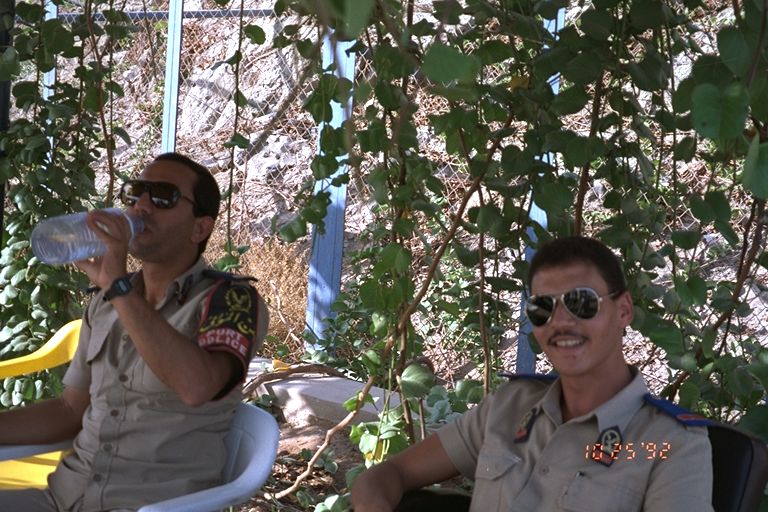 Once there, we discovered that the Egyptians have the happiest government officers on the face of the planet. Everyone wearing a uniform on the Egyptian side was all smiles. Sure, they went through our suitcases, undoing the morning's careful packing, but they were pleasant as could be about the whole thing. We were issued a temporary Egyptian license plate and sent on our way.