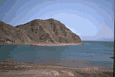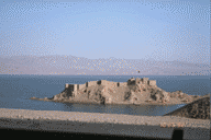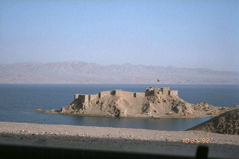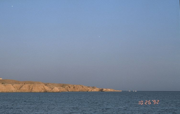 Our eventual destination was the resort town of Sharm El-Sheikh, about halfway down the peninsula on the western shore of the Red Sea. The drive took several hours; we passed several interesting sights such as the island castle at the top of the page. As the daylight faded, my friend and I amused ourselves by figuring out how to read Arabic numbers thanks to all the kilometer markers by the side of the highway. We passed a couple checkpoints along the way; both were manned by grinning Egyptian policemen who waved us through with a hearty "Salaam."