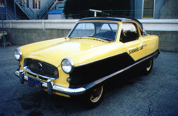 Hello Stan! Just found your site. Very cool. I'm selling the old Metro, which still has "Stanard Cab" on both doors, and thought there might be a spot somewhere you could include the pix for any fans out there who might possibly be interested in buying it. I've advertised elsewhere and had a few nibbles, but no serious bites yet. 1956 Nash Metropolitan. Featured prominently in Stan Ridgway's "drive she said" music video. Runs great, new interior (luxurious black carpet, side panels, upholstery, new white headliner and sunvisors), new wiring harness, etc, etc. Yellow and black. Owned for over 15 years and put more than $10,000 into replacing, repairing and improving the car. You name it, Valentine's Metropolitan Pit Stop near here has probably it replaced it. Asking $3800.00 Contact Andrew Doucette at (213) 669-8655 or E-Mail me at Acd56@aol.com Thanks.Sounds like a good deal to me. And if it's not enough for you that it's the Drive She Said taxi, you should remember that Lieutenant Columbo also drove a Nash Metropolitan. (Though his wasn't in nearly as fine condition.)