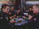 The command staff arrives for breakfast to find Sheridan leaned up against the wall carrying on a conversation with himself. Their attempts to engage him don't get through, but his occasional outbursts of laughter disturb their conversation. Trying to form the non-aligned worlds into a union again is a daunting task, they agree, but one that must be done.