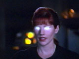 ...and Garibaldi wakes with a start. It was a dream. Sitting on his bed is Lyta, her eyes glowing. She explains she has decided to stop hiding what the Vorlons did to her, and she is testing her limits. But Garibaldi shouldn't have woken up. "This is just a dream," she tells him, and Garibaldi wakes up again. There is no one in the room.